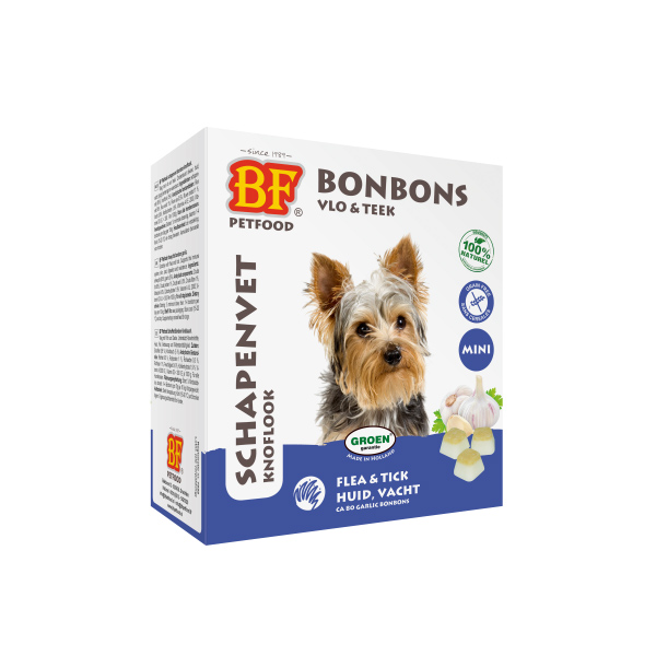 - Biofood Knoflook, Zeewier en Zalm 80 stuks Mini: 1-4 bonbons per 10 kg per dag.