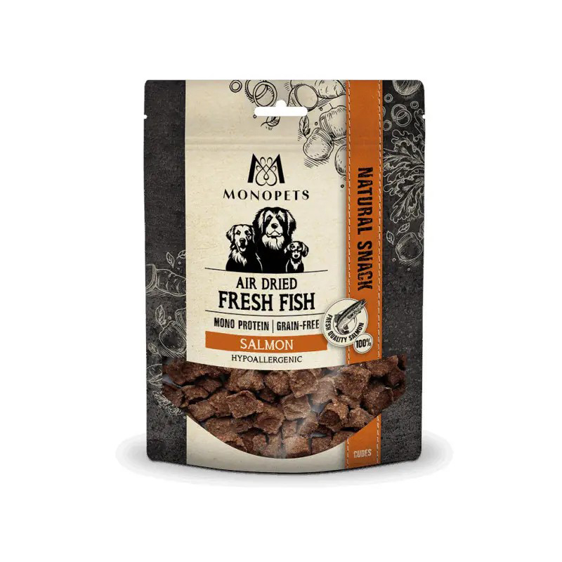 De Monopets Air Dried Fresh Fish Salmon Cubes XL zijn een natuurlijke snack van 100% zalm. Door het luchtgedroogde proces blijven smaak en voedingsstoffen goed behouden. Deze snack is geschikt als tussendoortje of beloning en kan gegeven worden aan honden van alle formaten. Dankzij de eenvoudige samenstelling is het een goed verteerbare snack, geschikt voor alle levensfasen.